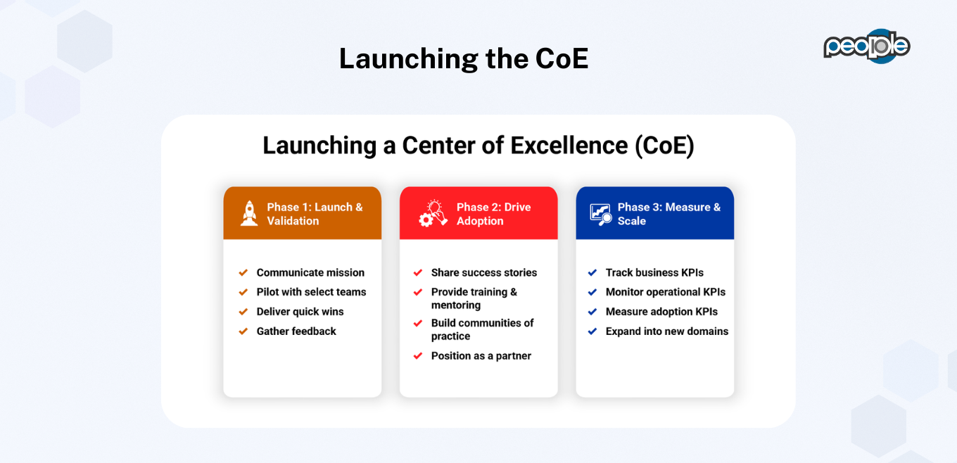 A successful CoE launch begins with validation and credibility. A soft launch or pilot phase allows you to test the model, gather feedback, and refine operations. Early wins build momentum and prove the value of the CoE across the organization.