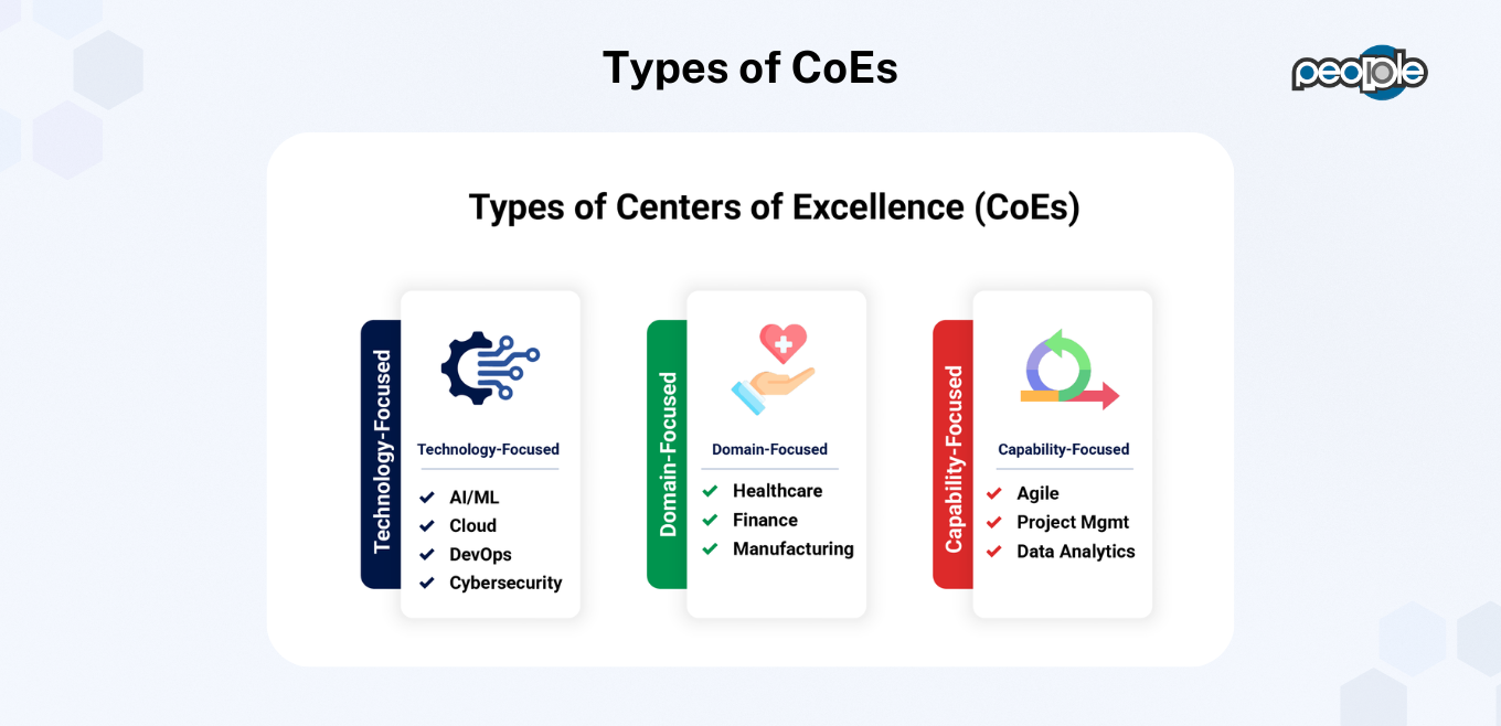 A Center of Excellence can take different forms depending on the challenges you want to solve and the outcomes you expect. The type you establish must align with your organization’s priorities, current maturity, and long-term strategy. Choosing the right focus area ensures that the CoE generates impact from day one and scales with purpose.