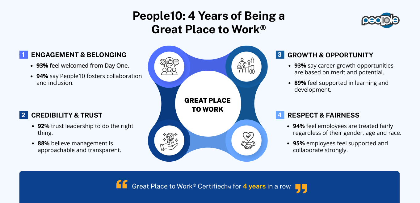 At People10, work is more than a job—it’s where people grow, ideas matter, and futures are built. We’re proud to be Great Place to Work® Certified™ for the fourth year (Aug 2025–Aug 2026). This recognition reflects our culture of trust, collaboration, and innovation—where engineering excellence and human potential thrive side by side.